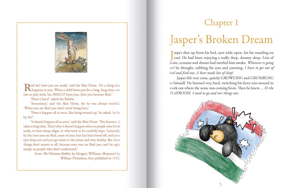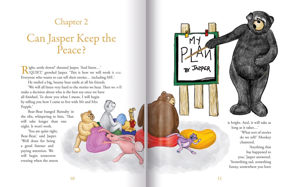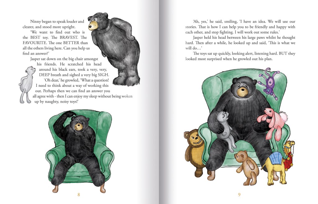 Jasper, the big, friendly Canadian bear, is rudely awoken from a lovely, dreamy sleep. The other toys in the playroom are being very noisy, arguing over who is the best toy. Poor Jasper can’t get back to sleep. Luckily, he is a wise and resourceful bear. He devises a plan to end the squabbling: he will get them to listen to each other’s stories: