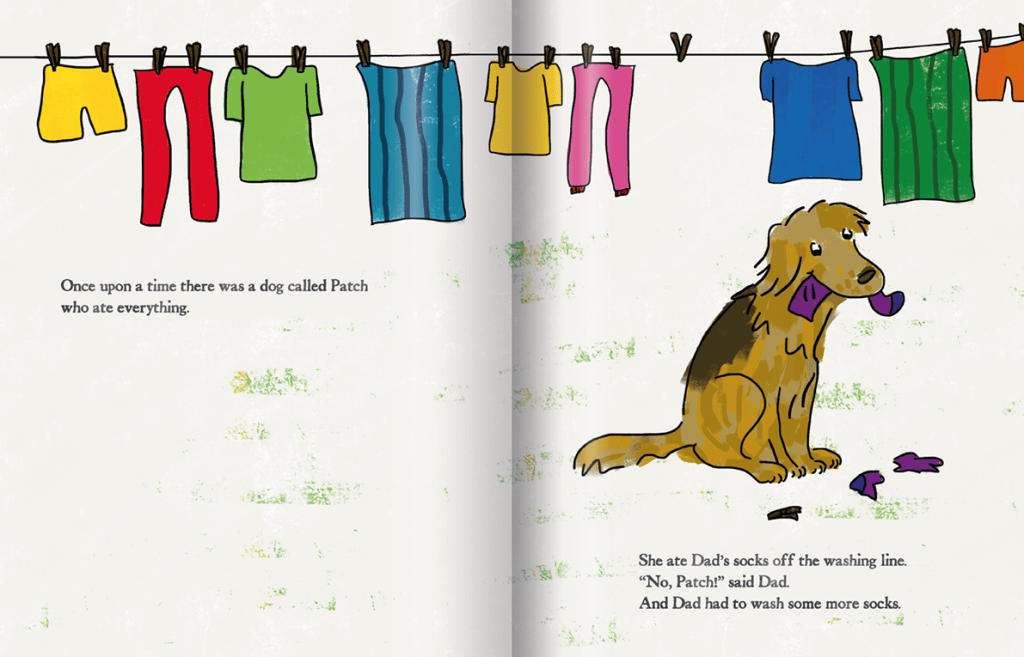 “Patch the dog loves to eat, but her tastes are a little unconventional. Socks, soap, letters, rugs, wellies, baskets – she chows down on anything she can get her paws on and her poor family doesn’t know what to do. How can they stop Patch from eating all their belongings?