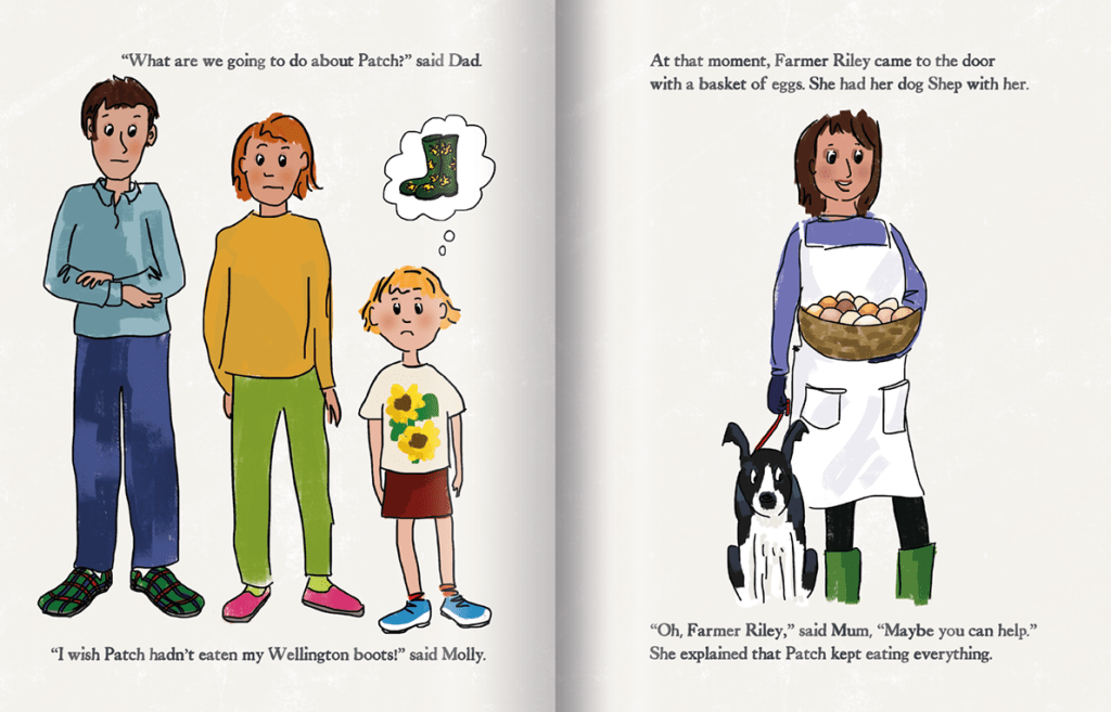 Patch the dog eats EVERYTHING and Molly and her mum and dad just don’t know what to do. Follow her hilarious adventure as she eats her way through soap, a house plant, Molly’s boots, dad’s socks and anything else she can find until mum, dad and Molly have had enough. Farmer Riley has an idea, but it doesn’t quite go to plan…